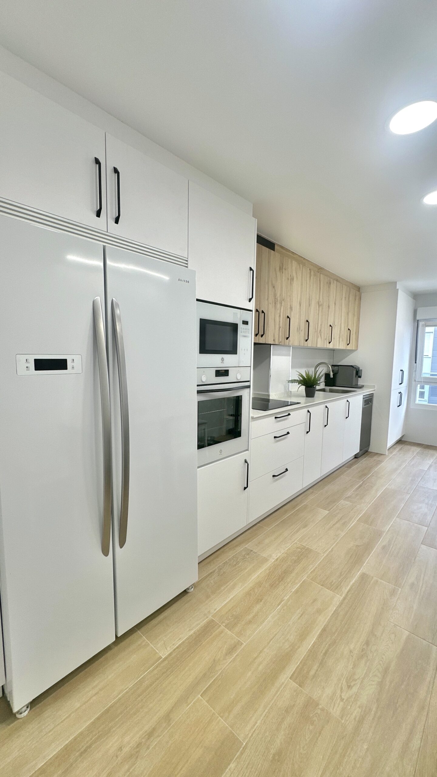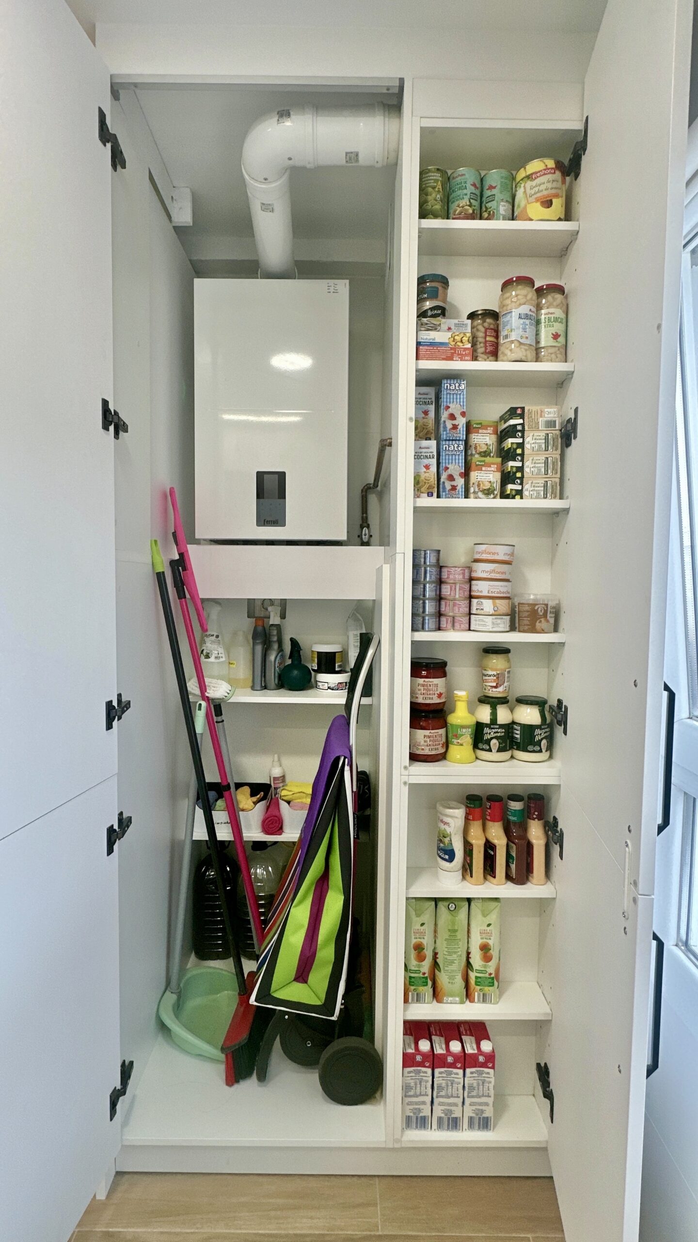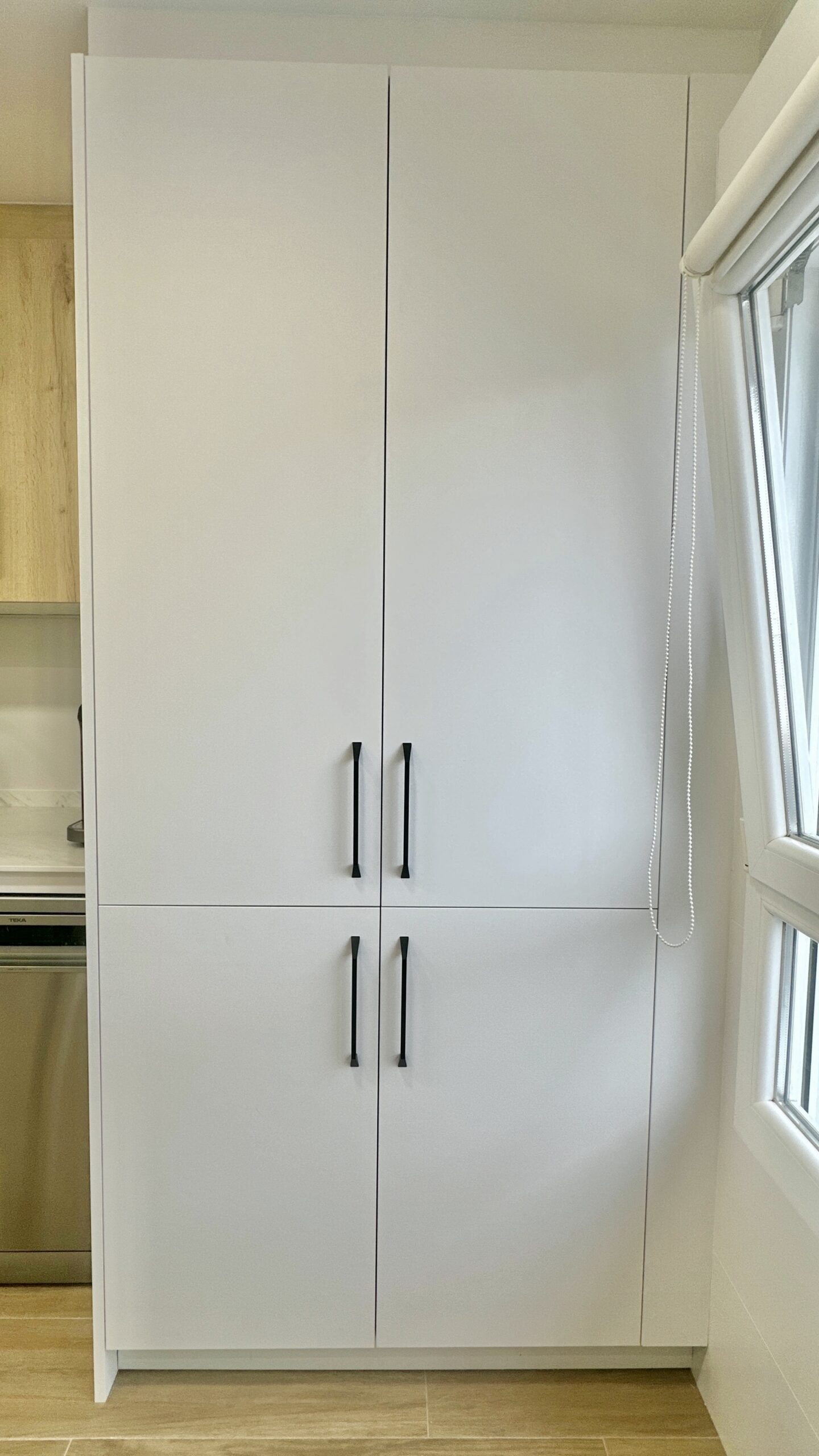 Los frigoríficos americanos necesitan bastante espacio en la apertura de las puertas para que salgan los cajones, en el lado izquierdo aprovechamos esta necesidad para hacer un despensero.