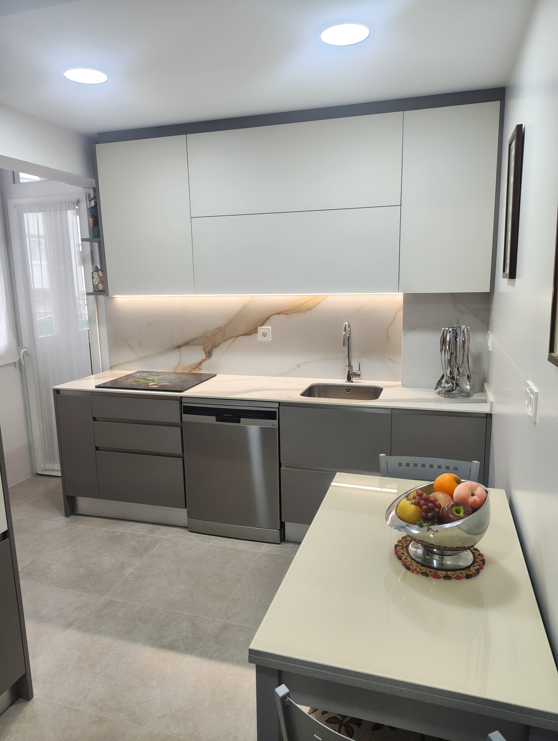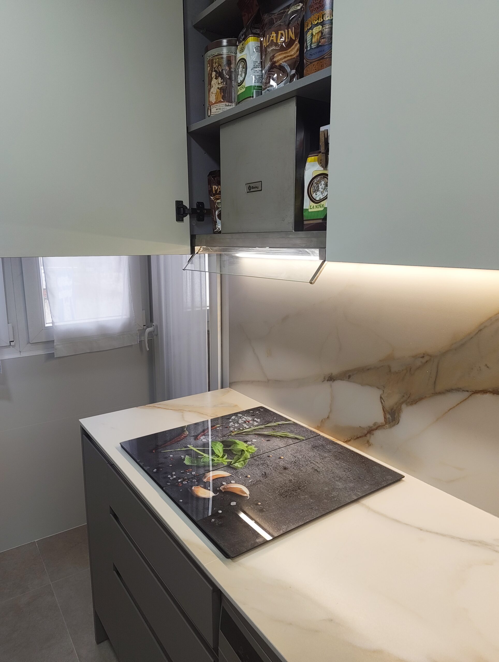 La encimera y el frente están realizados en porcelánico Techlam Marvel Gold de 12 mm de espesor. Su fondo blanco puro, atravesado por delicadas vetas doradas y grises, se inspira en mármoles como el Calacatta Gold, aportando distinción y sofisticación al conjunto.
