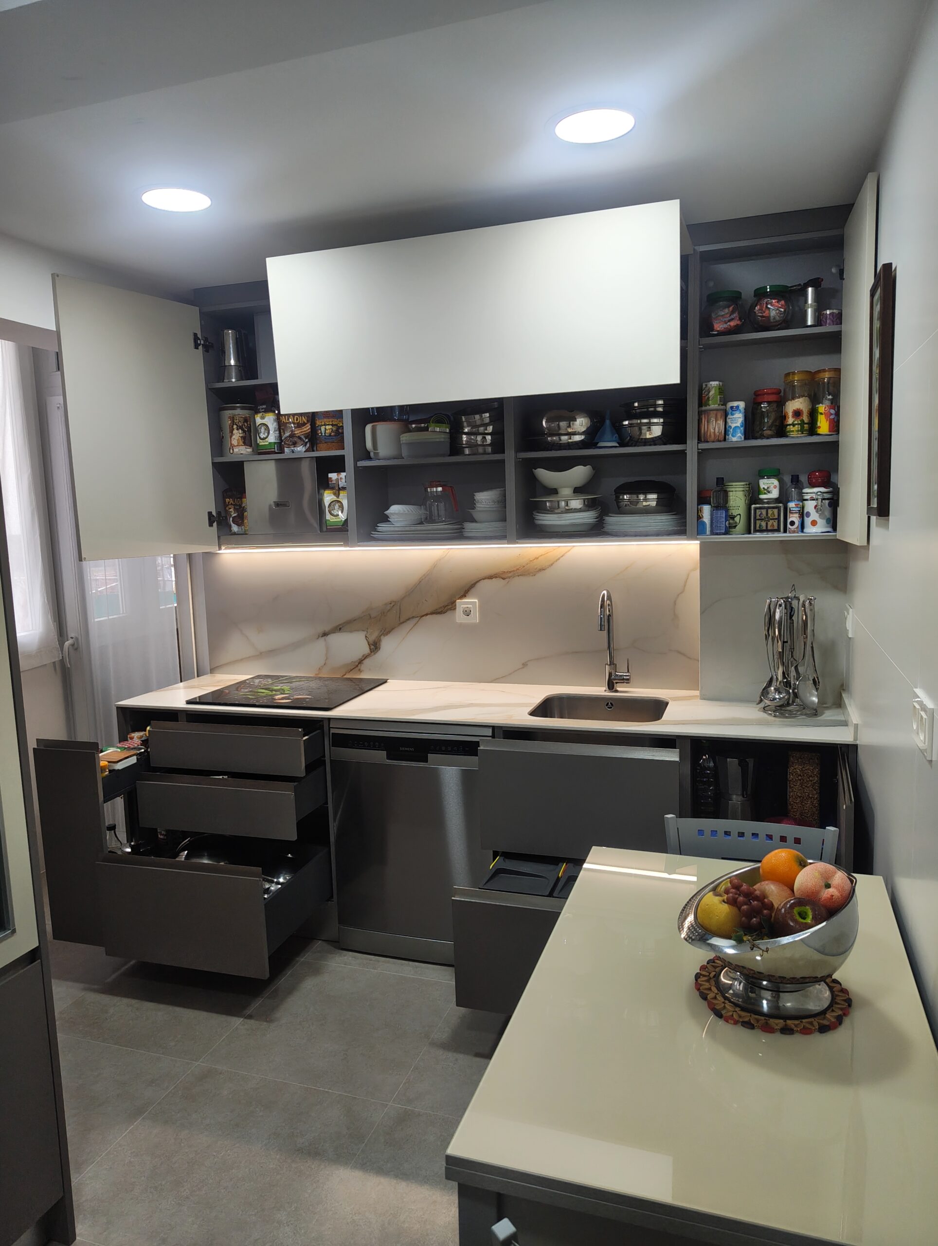 La propuesta combina muebles bajos en acabado Basalt con uñero en acero inoxidable y módulos altos en tono Beige Nude. El interior, en gris aluminio hidrófugo, garantiza resistencia y un acabado sofisticado.