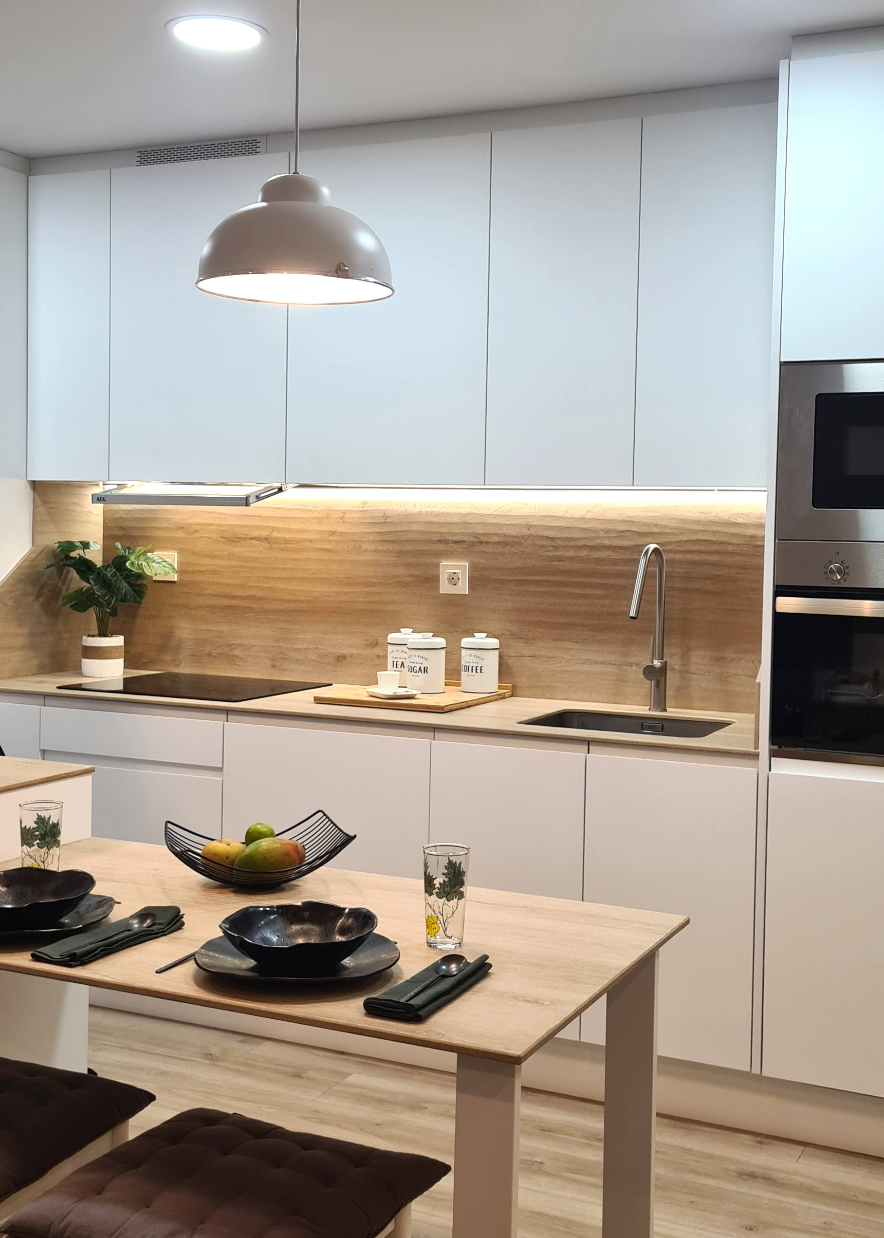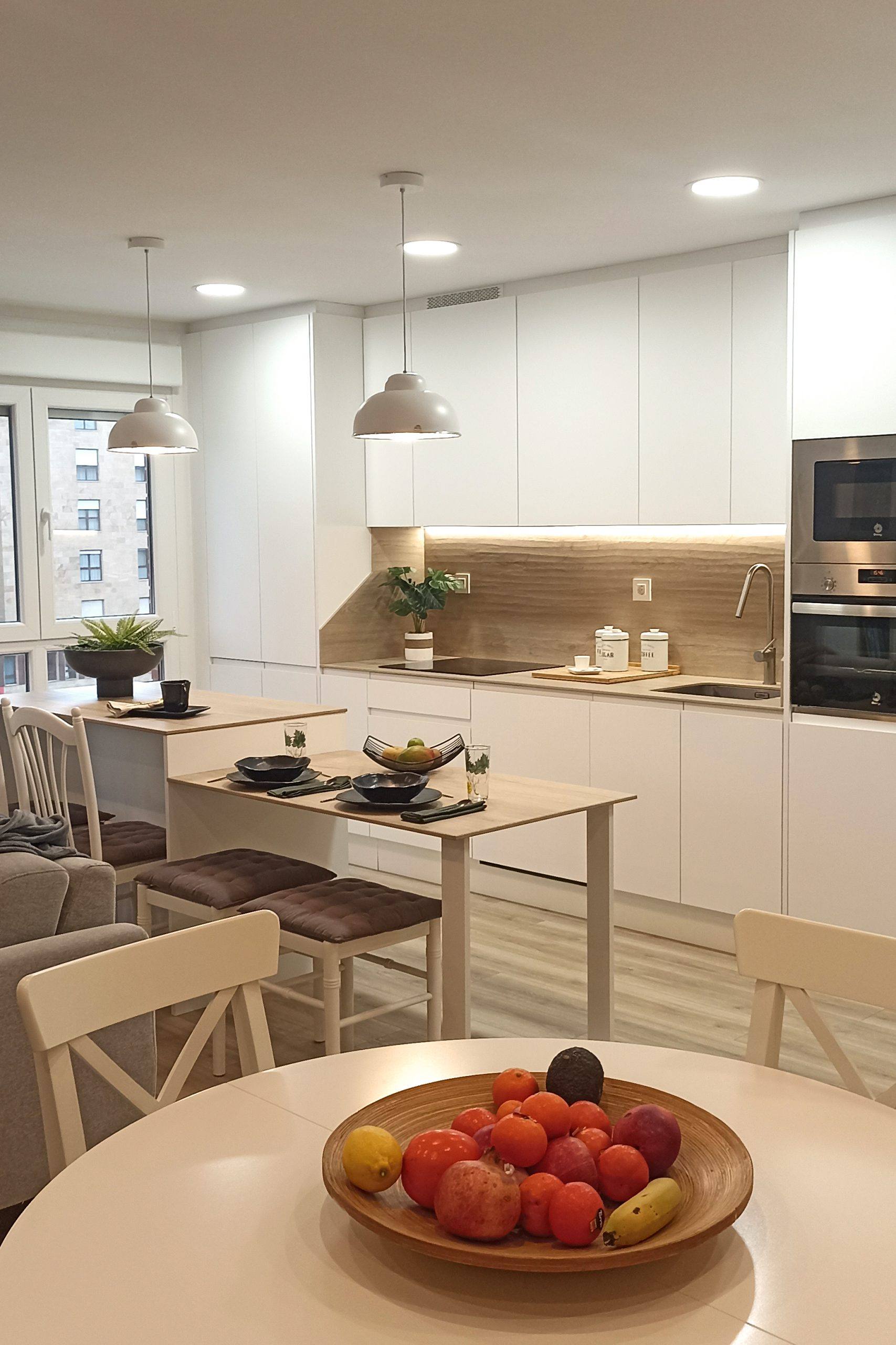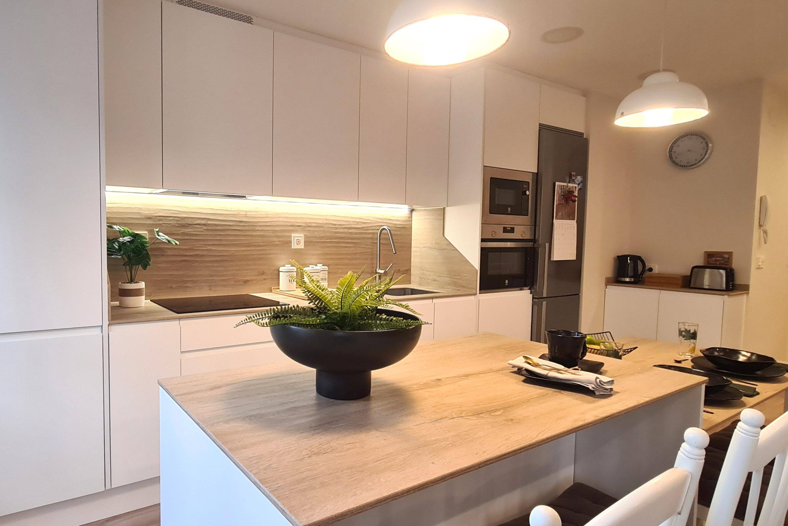 En esta cocina con isla incluimos una mesa del mismo material que la encimera: @sapienstone Rovere Busksin de 1,2 cm de grosor. Es una opción de diseño bastante popular en las cocinas modernas porque consigues funcionalidad y versatilidad.