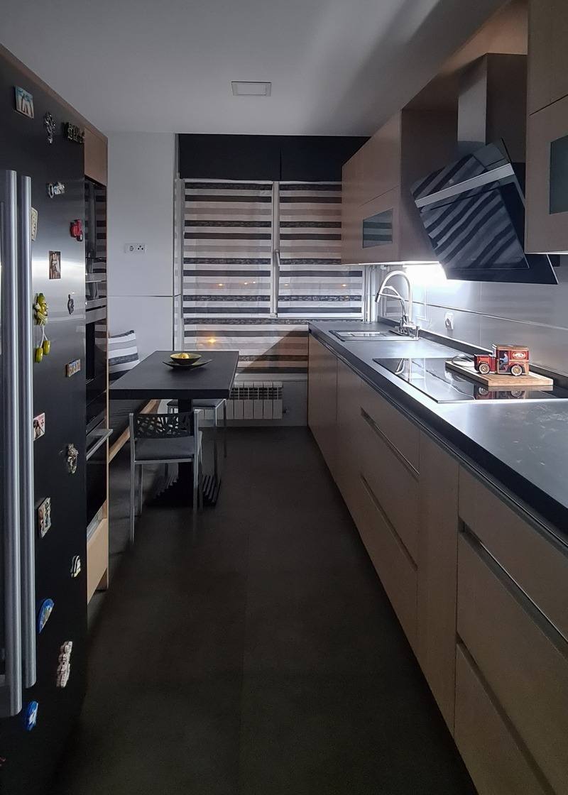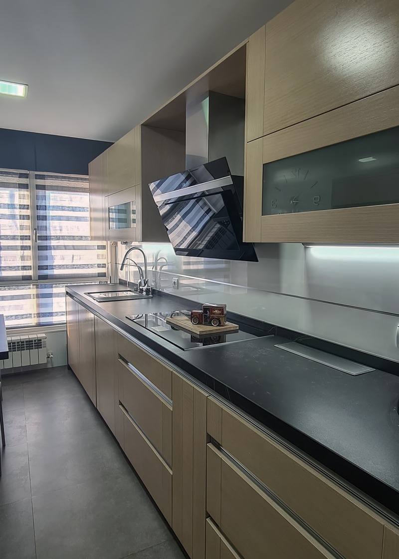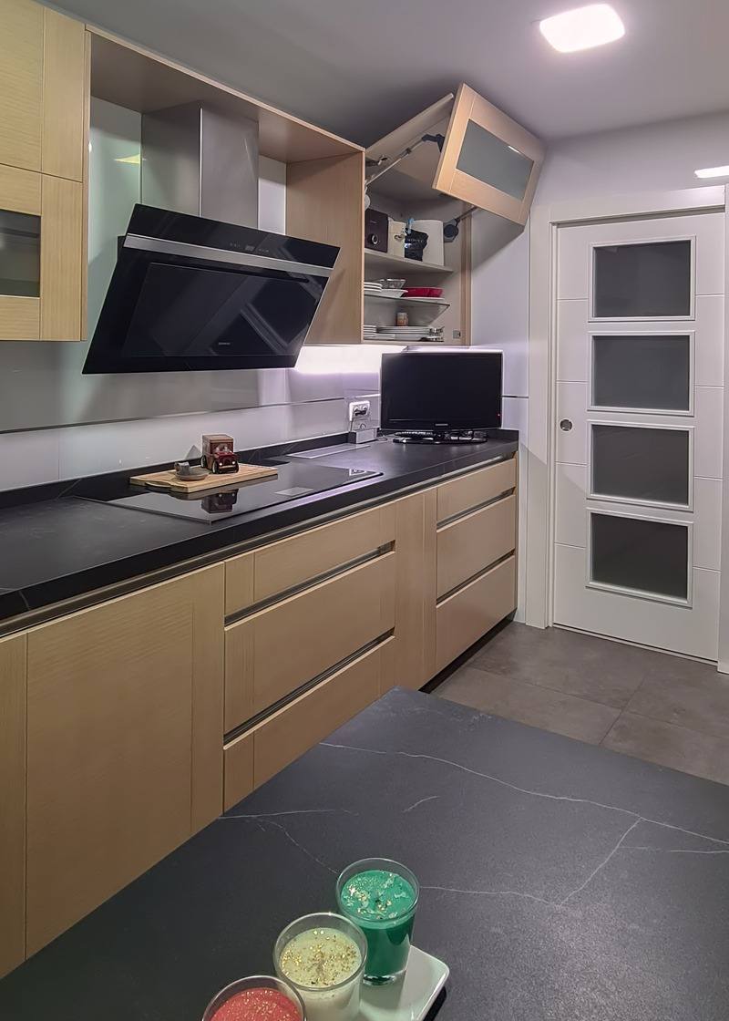 El tablero marino de roble con gola se convierte en protagonista. En esta ocasión lo hemos combinado con una encimera de Dekton ingletada 5 cm y luces bajo los muebles altos.