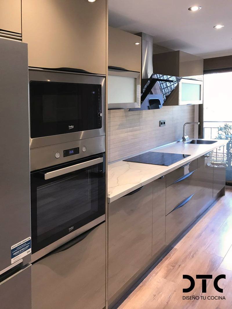 Los altos de vitrina abatible a cada lado de la campana le da ligereza y son muy funcionales para tenerlo todo a mano y no perder tiempo cuando estamos solos ante los fogones. Las vitrinas nos ayudan a tenerlo todo bien organizado y ordenado.