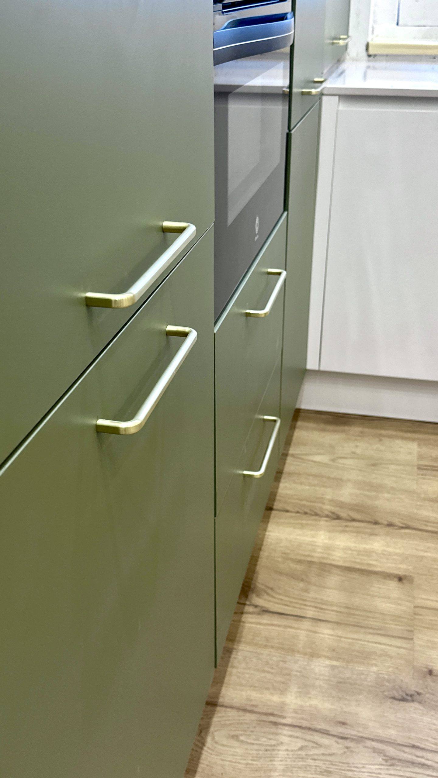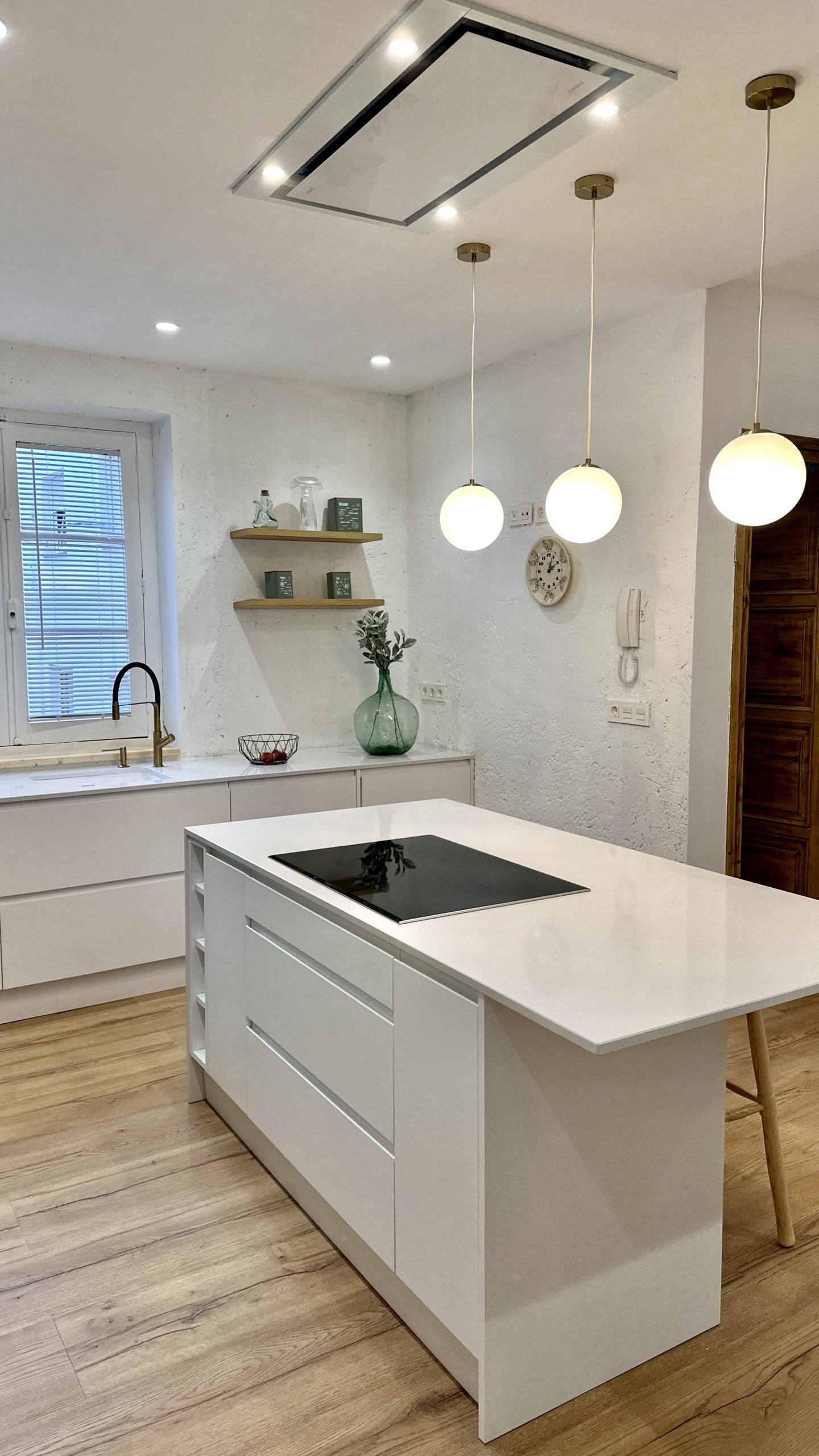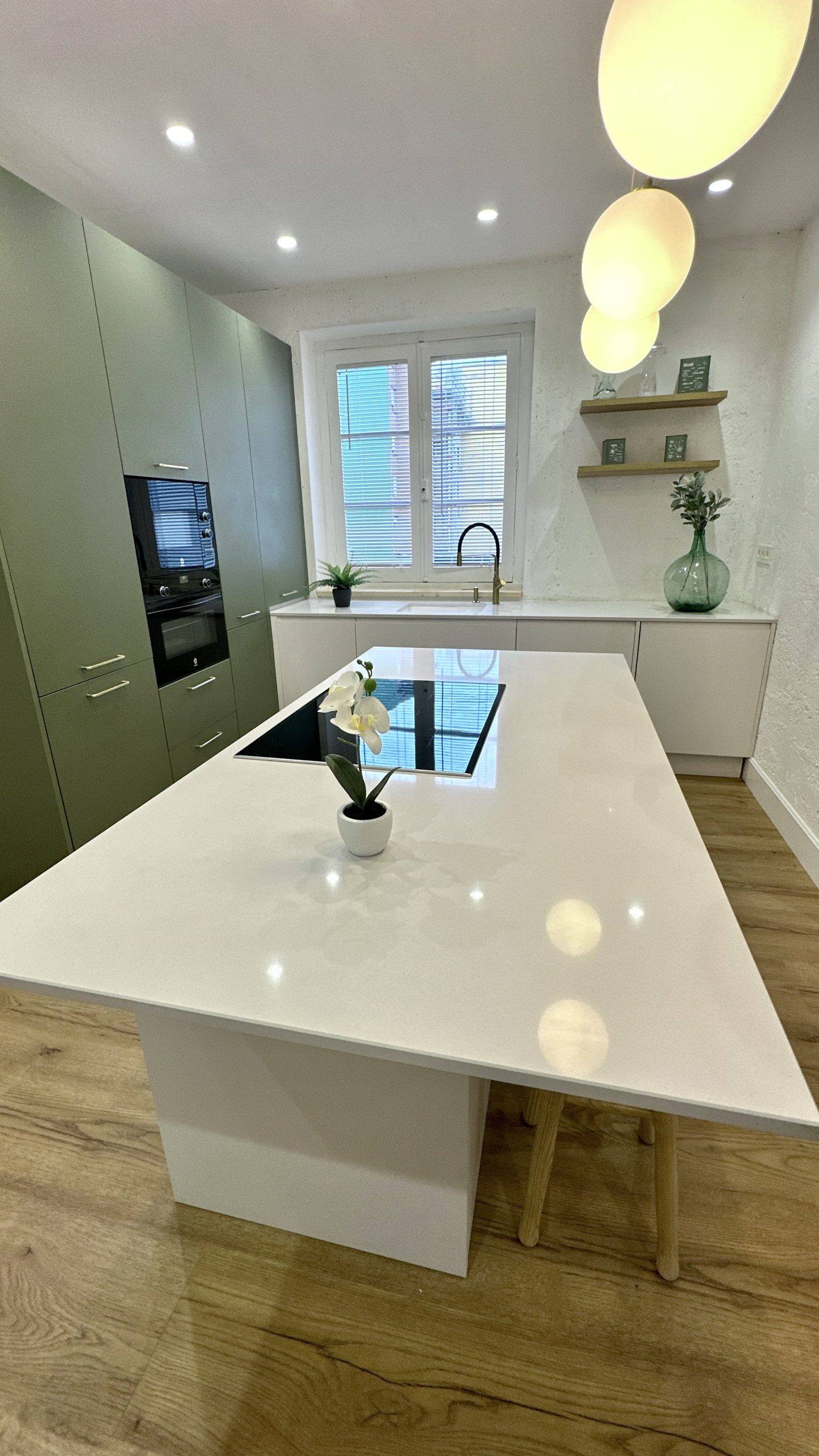 Un verde militar en la zona de columnas, dejando el blanco para los armarios bajos. Y una sencilla encimera de Silestone blanca.