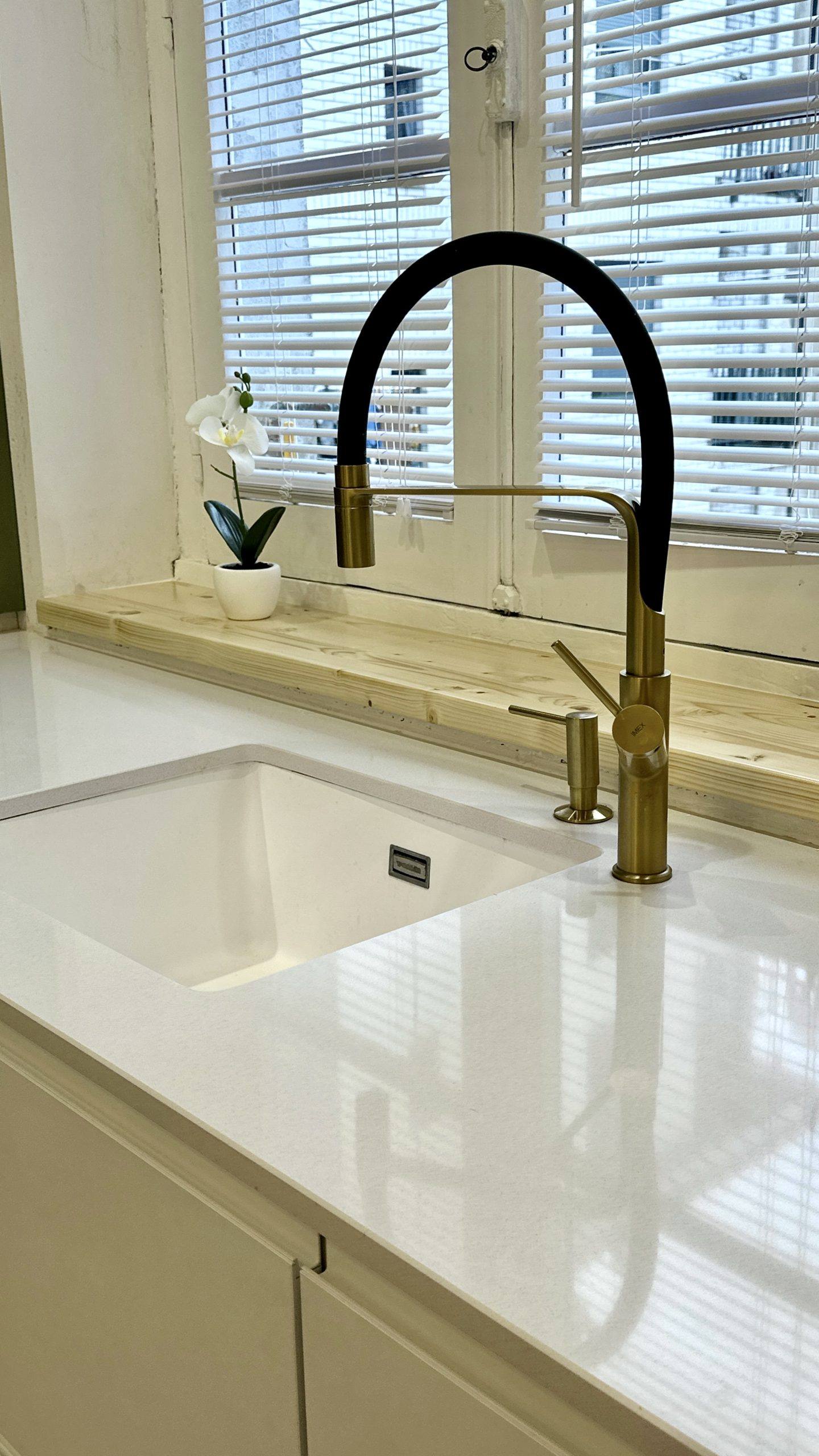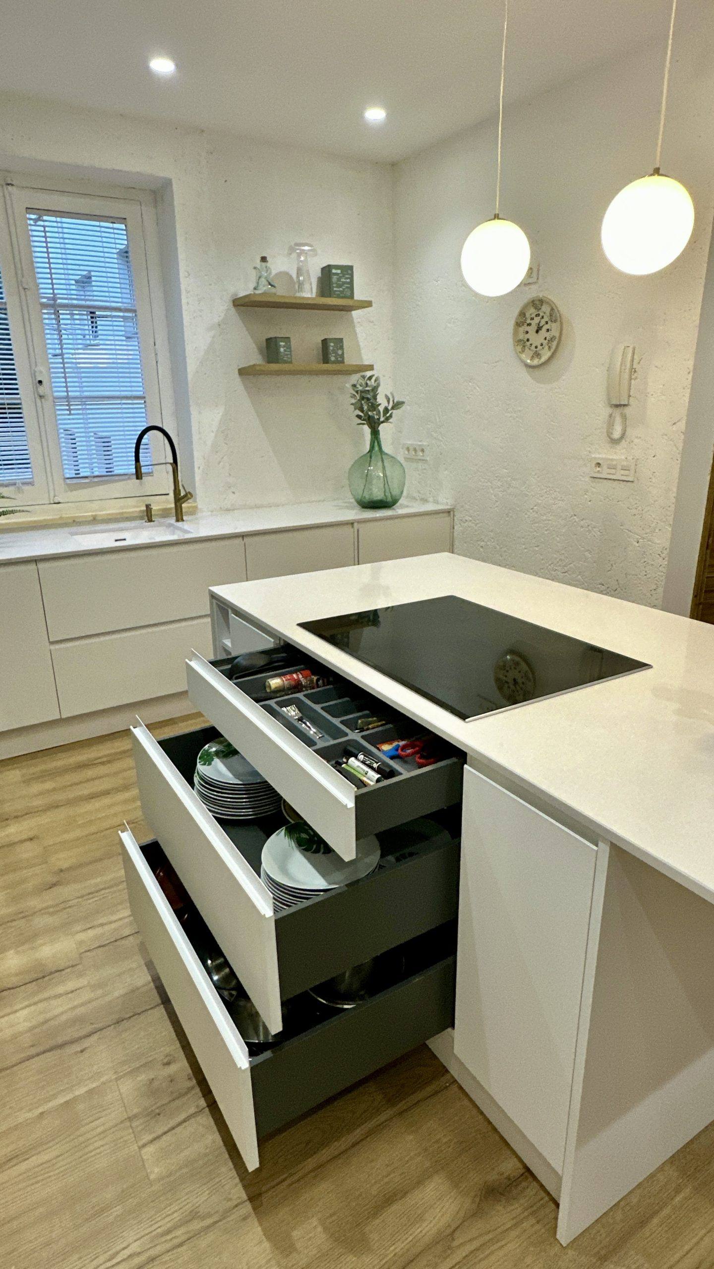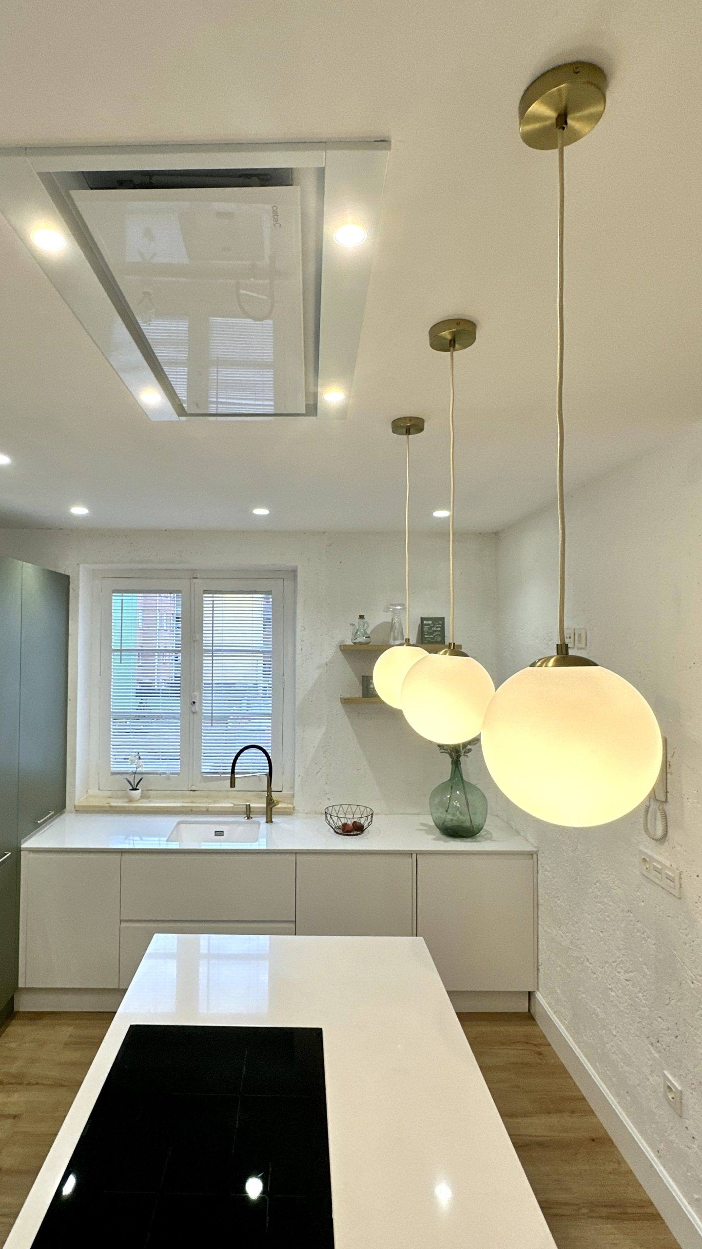 Un verde militar en la zona de columnas, dejando el blanco para los armarios bajos. Y una sencilla encimera de Silestone blanca.