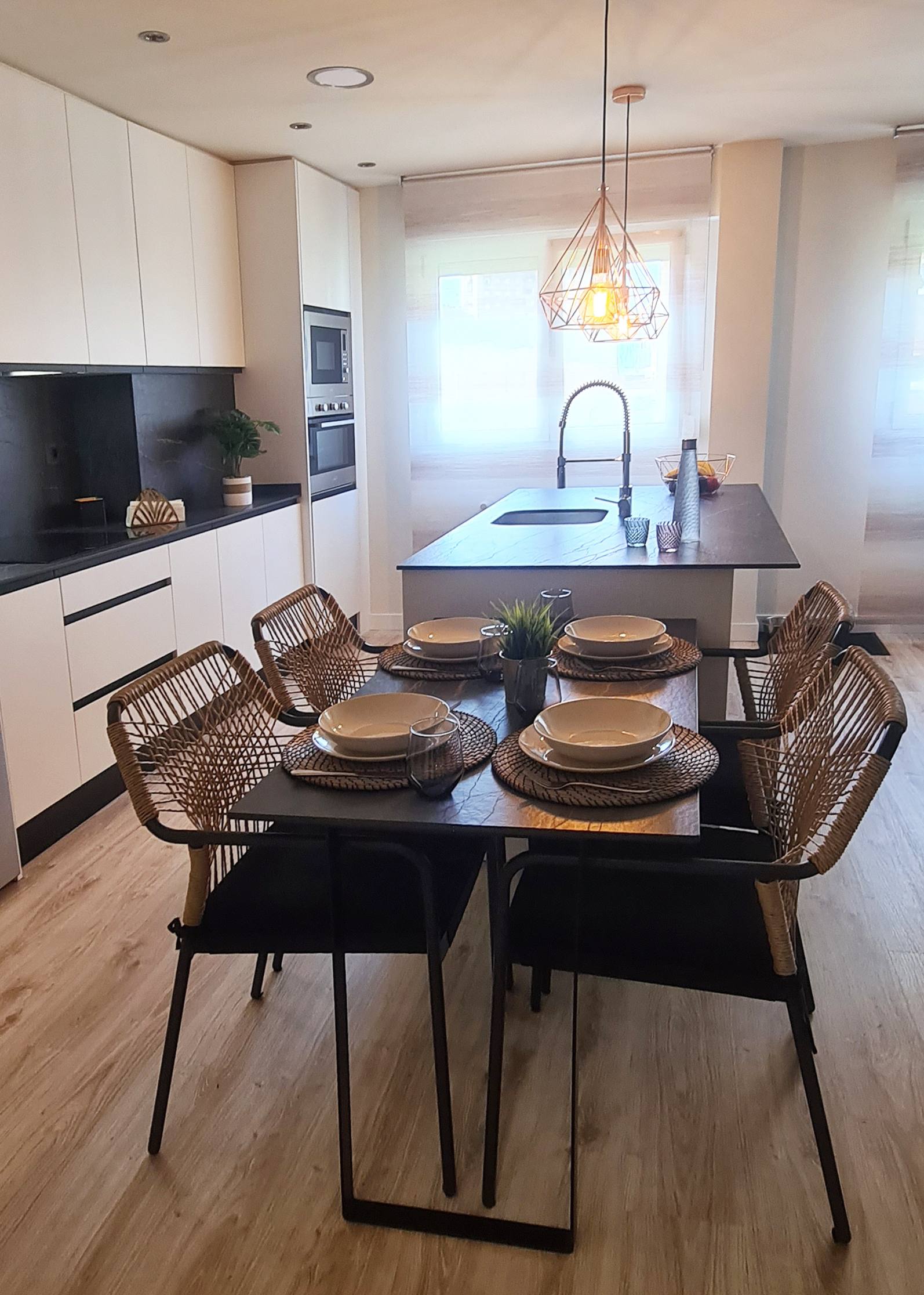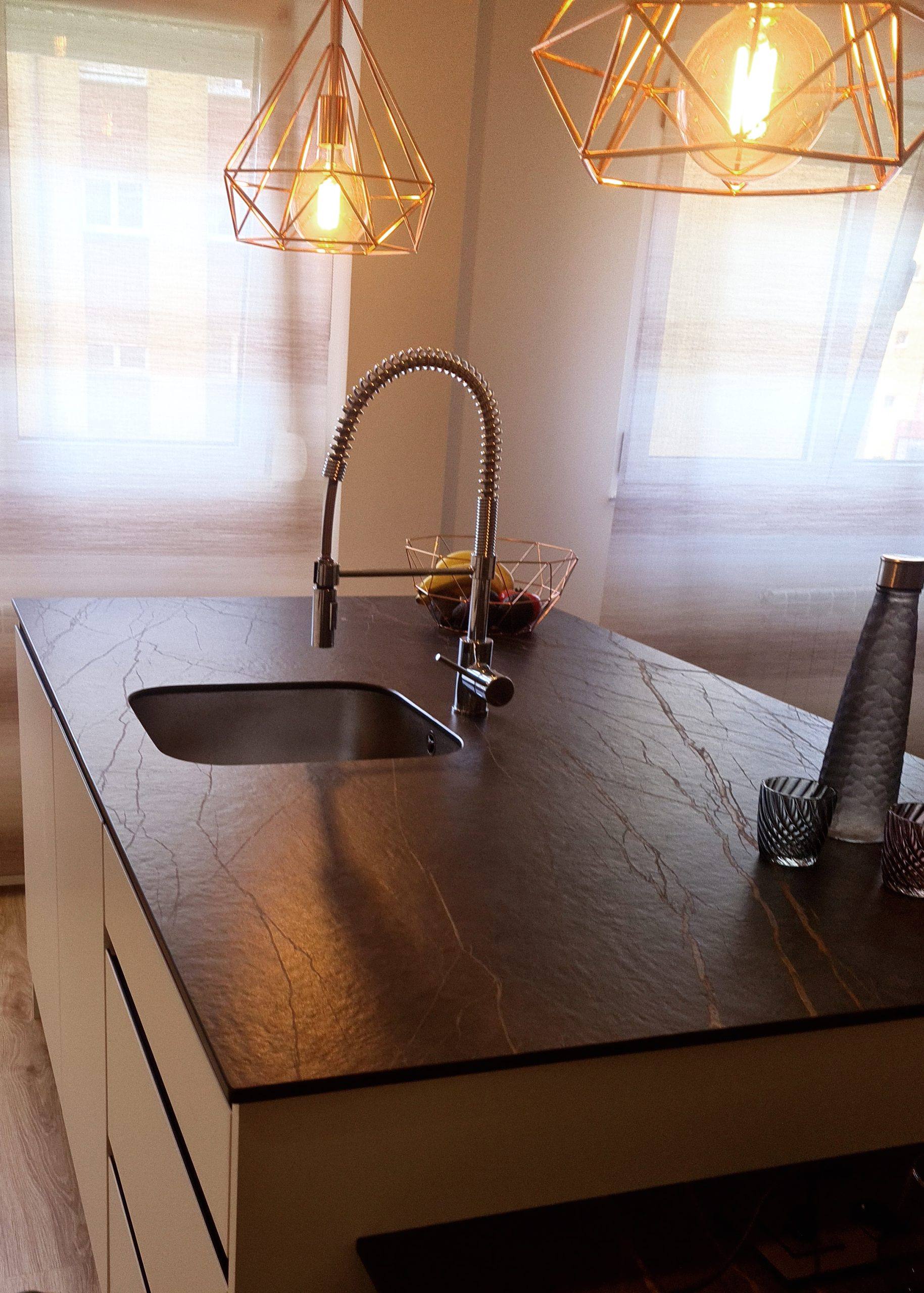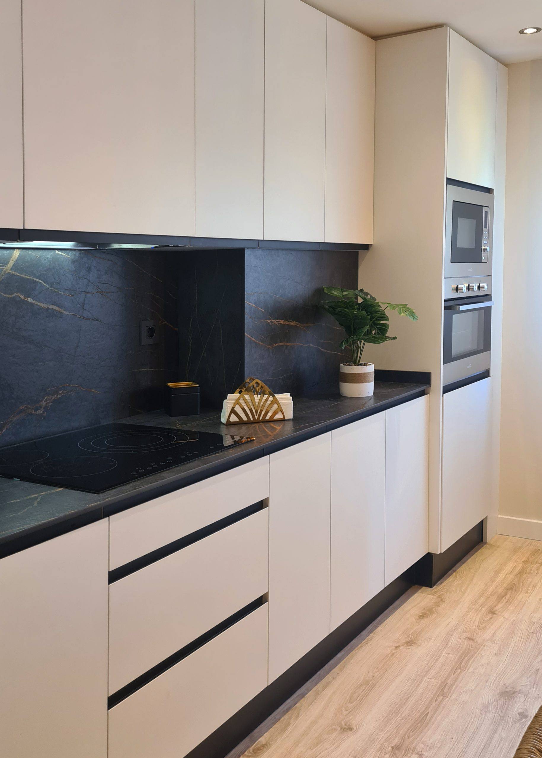 El color perla es suave y neutral, convirtiéndolo en una excelente elección para espacios pequeños haciendo que parezcan más amplios y luminosos. Al mismo tiempo, la encimera de silestone en color Noka aporta el contraste necesario.