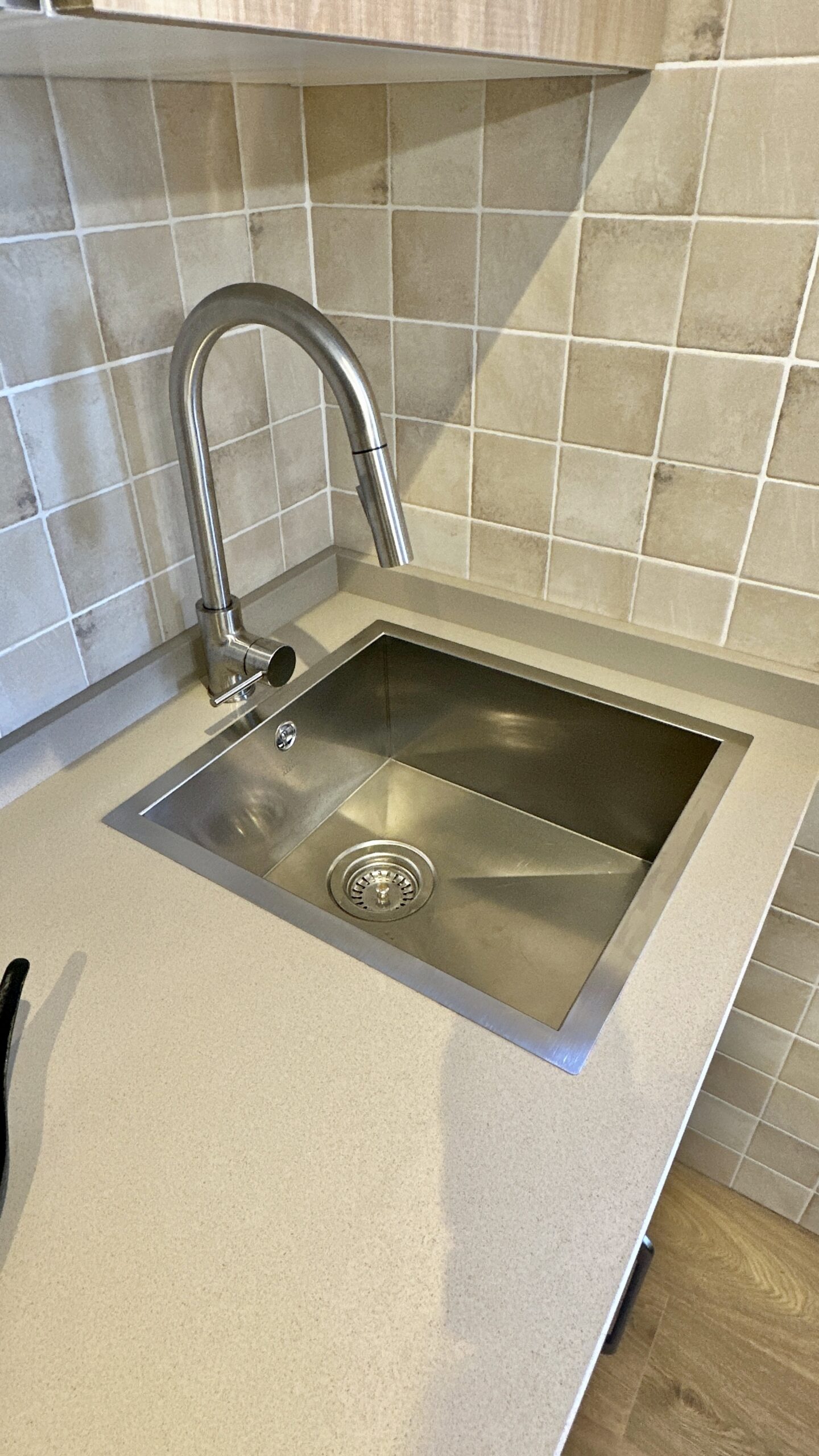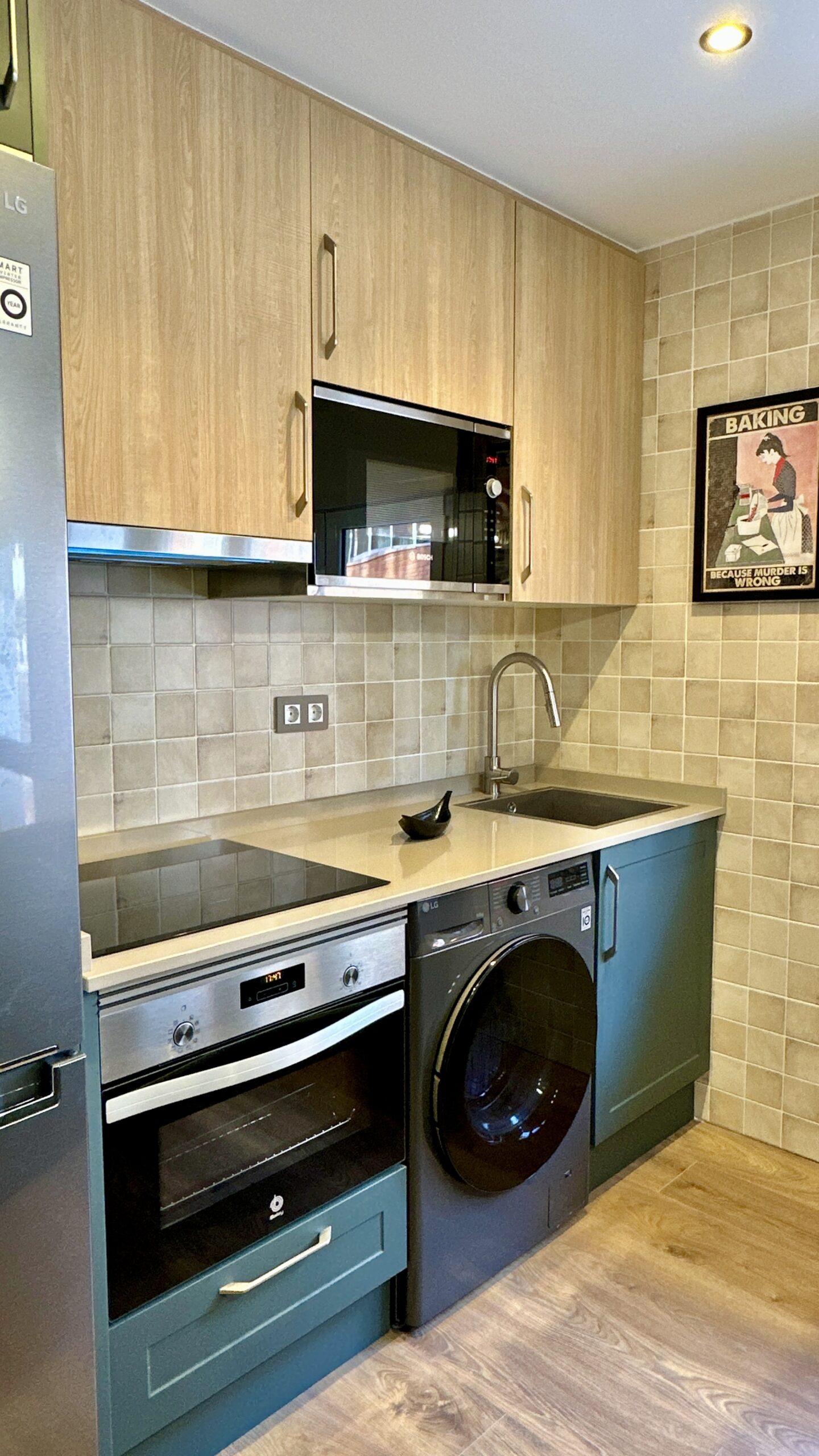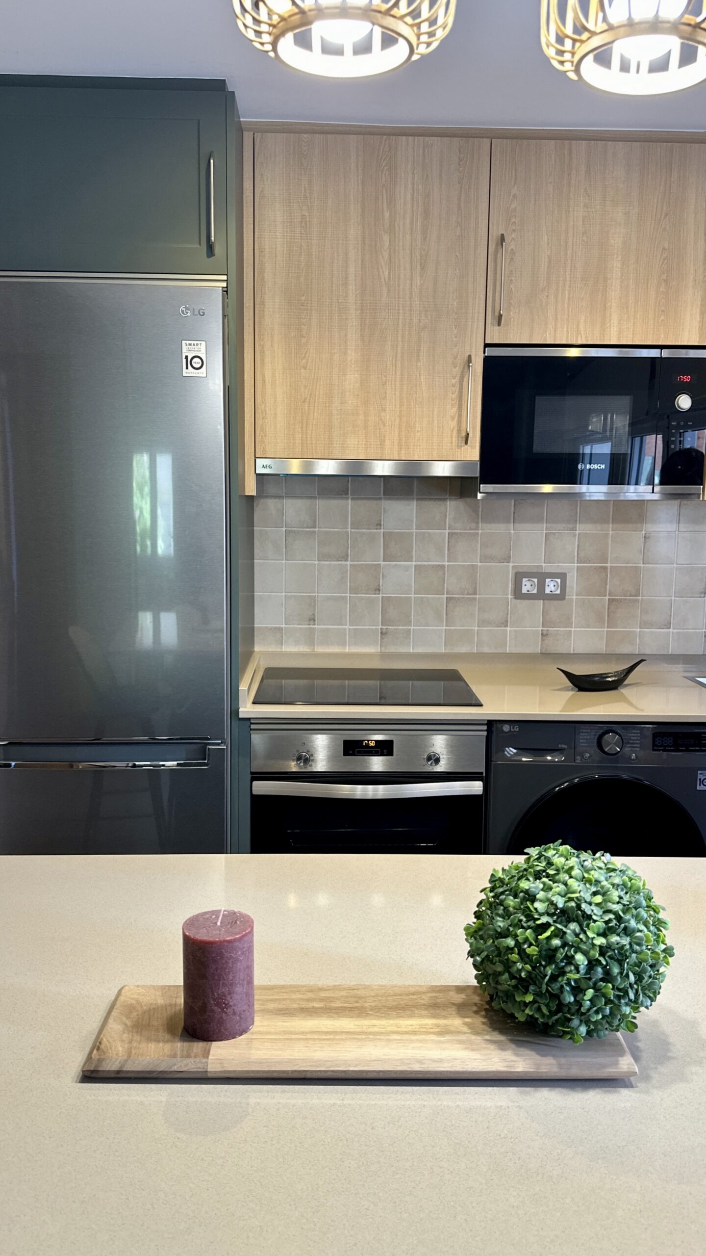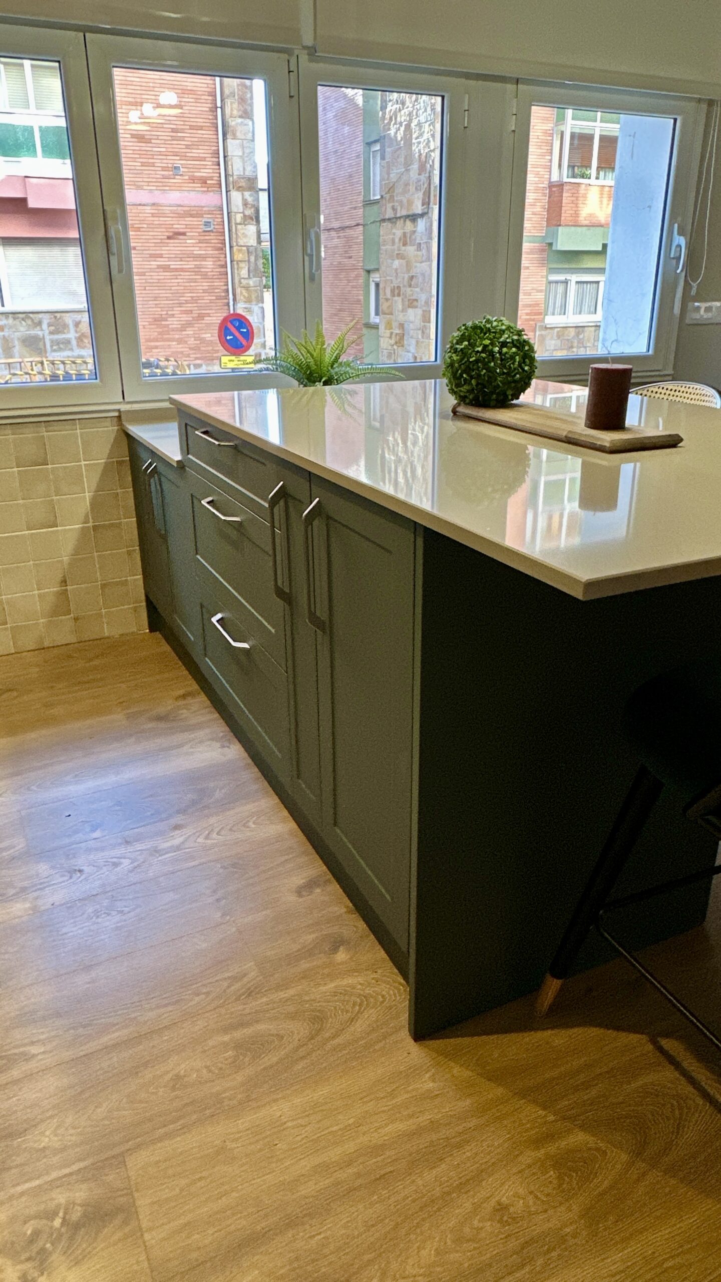 Esta cocina es bastante diferente en su conjunto, la península con diferente nivel, es lo interesante a destacar. También hay que considerar el despensero estrecho al lado del frigorífico, que sirve, tanto para aprovechar la columna que tiene detrás, como de almacenaje.